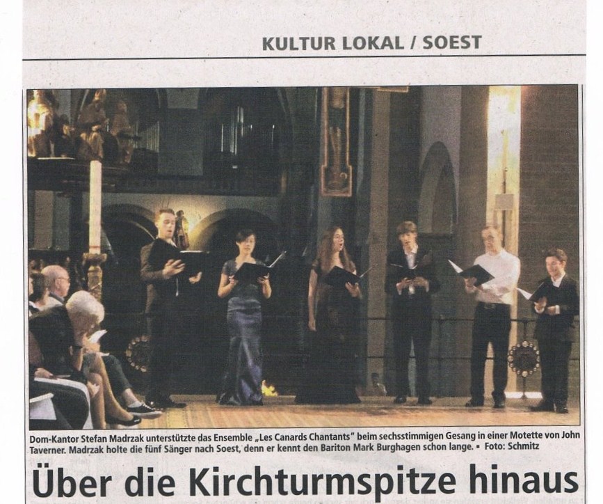“Die perfekt aufeinander eingestellten Stimmen des Vokalensembles ‘Les Canards Chantants’ verschmolzen in den Duo- und Trioabschnitten zu einem kraftvollen Gesamtklang und ließen die von ausgreifenden Melismen bestimmten Chorpassagen transparent hervortreten. Dem Ensemble gelang eine sängerische Leistung auf höchstem Niveau. Bravourös hielt es die Spannung über die weiten, anspruchsvollen Melodiebögen in dieser Musik der englischen Frührenaissance.” – Peter Schmitz, der Soester Anzeiger, July 2013