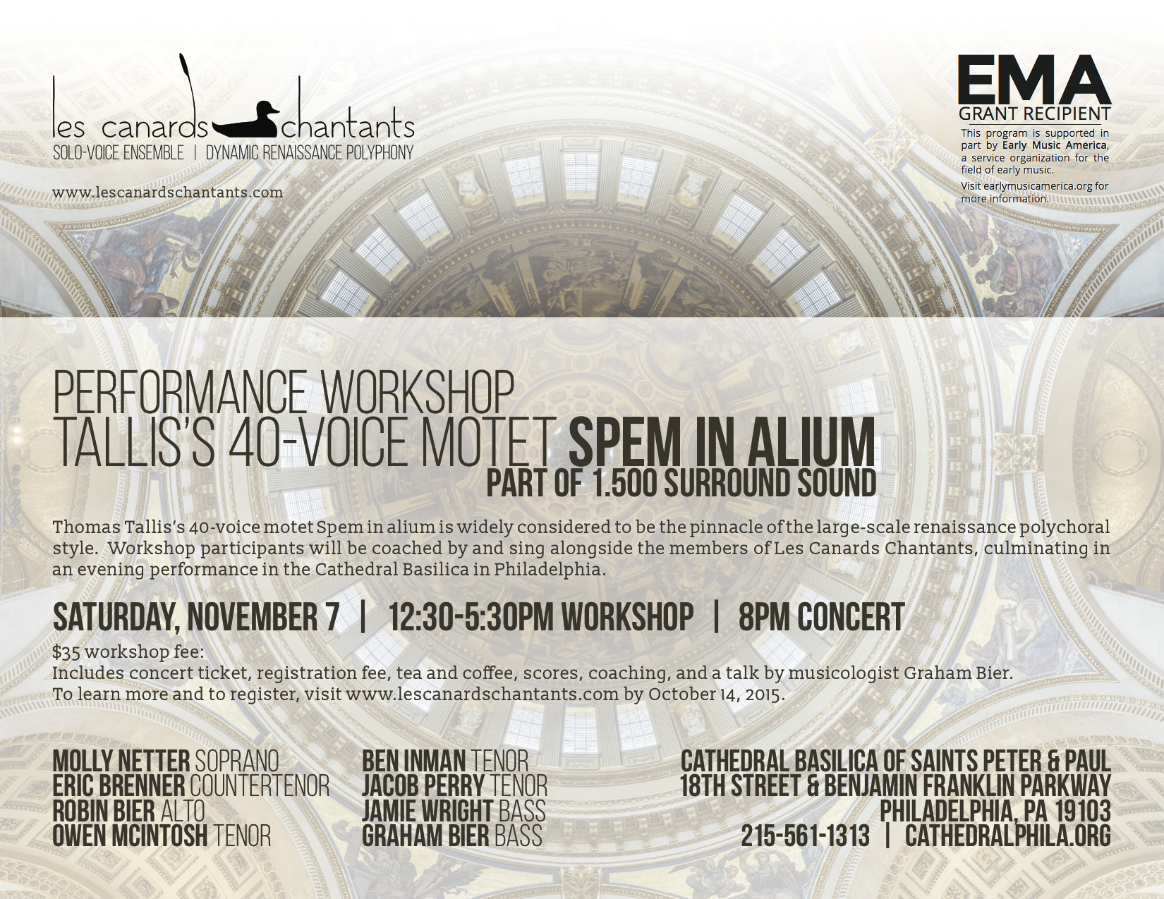 Workshop participants will sing alongside and be coached by the members of Les Canards Chantants in tutti sessions and sectionals, working from a new edition of the score which represents the most recent scholarship. The workshop will also include a talk on the history of the piece by musicologist Graham Bier, and will culminate in an evening performance in the Basilica as the finale of 1.500 Surround Sound.